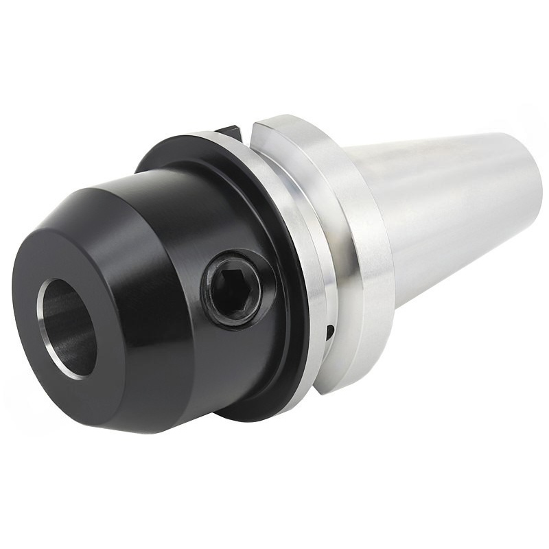 Конус по стандарту MAS403 BT50. Внутреннее отверстие диаметром 18 мм предназначено для установки фрез и другого инструмента с цилиндрическим хвостовиком, оснащённым продольной лыской (тип Weldon), в соответствии со стандартами DIN 1835-B и DIN 6535-HB. Фиксация инструмента обеспечивается единым зажимным винтом с шестигранным приводом, который упирается в лыску хвостовика, гарантируя надёжную и точную посадку.